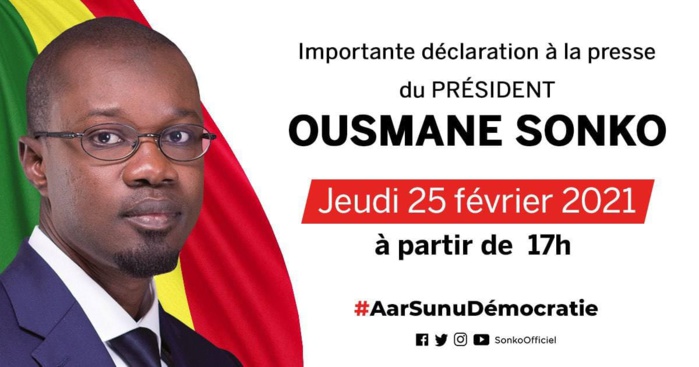Le leader Pastef Ousmane Sonko fera face à la presse ce jeudi 25 Février 2021 à 17 heures.