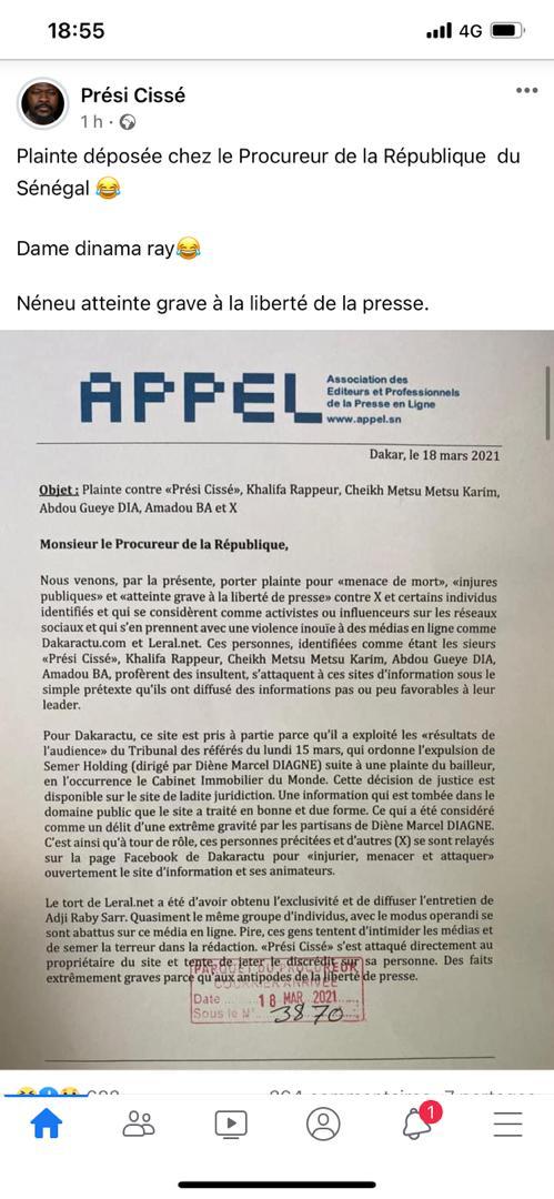 Le Syndicat des Professionnels de l'Information et de la Communication au Sénégal s’est félicité de la plainte déposée par l'Association des éditeurs et professionnels de la presse en ligne devant le procureur de la République pour menace de mort, injures publiques et atteinte grave à la liberté de presse contre Dakaractu et Leral. Ces sites étant visés par des activistes ou influenceurs sur les réseaux sociaux des délits précités . Le Synpics se félicite de cette démarche et demande aux autorités judiciaires de traiter cette affaire avec toute la rigueur qui sied. « Il est inconcevable que des attaques soient perpétrées contre un média qui a eu le seul tort d'exploiter une décision de justice bien visible et consultable sur le Net. Toute tentative de semer la terreur chez les journalistes sera combattue avec la dernière énergie », fera savoir le Synpics.